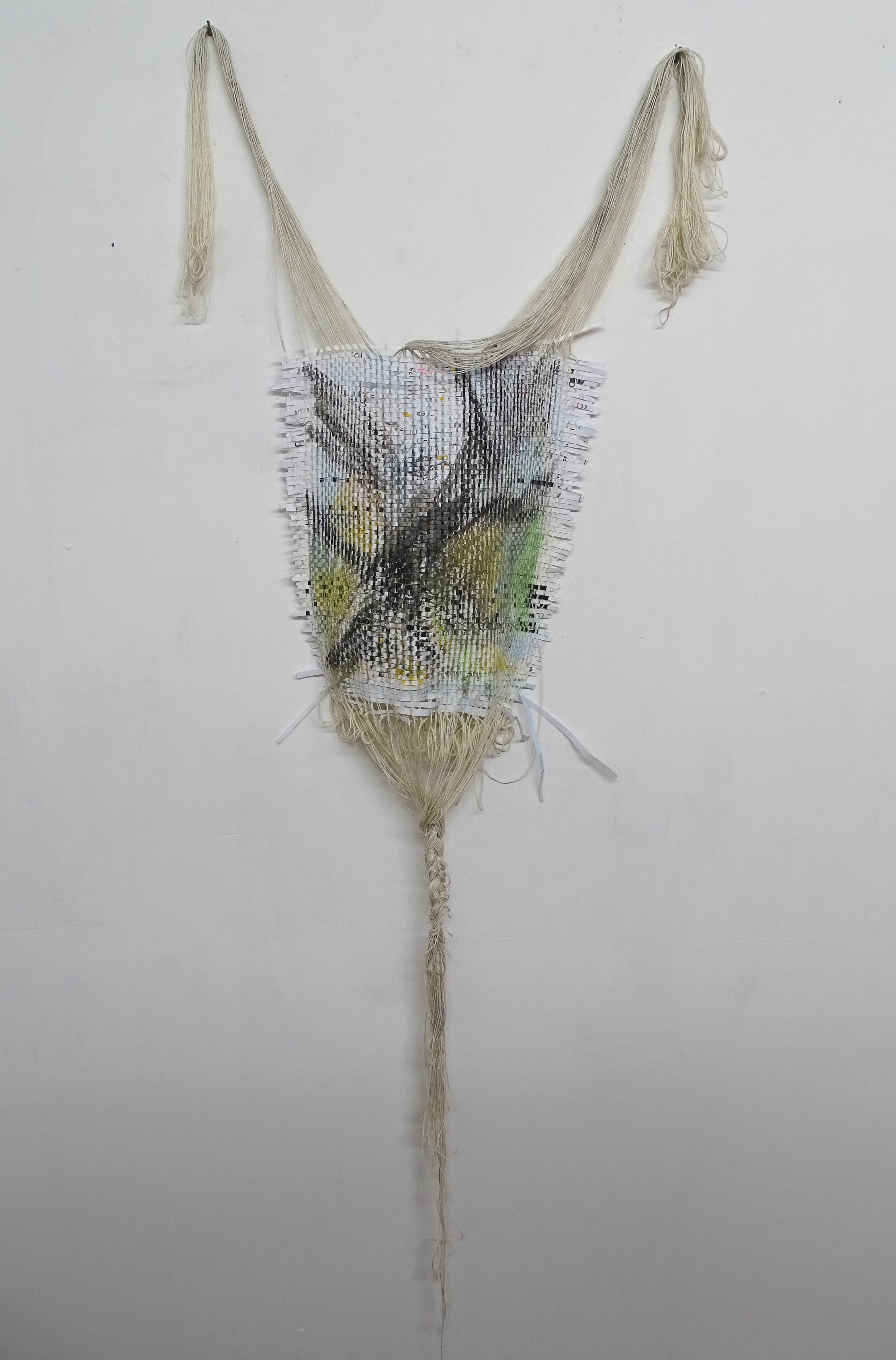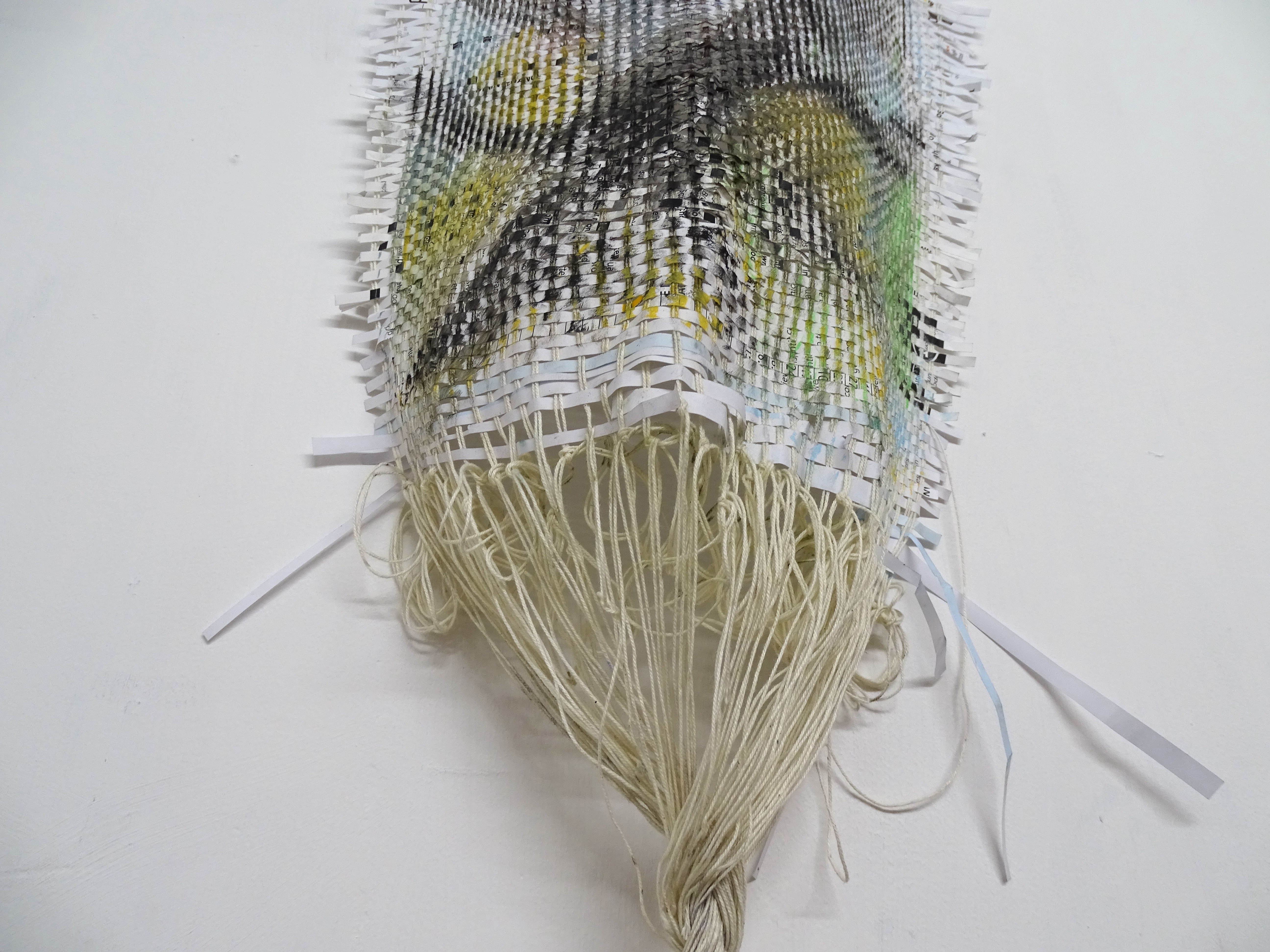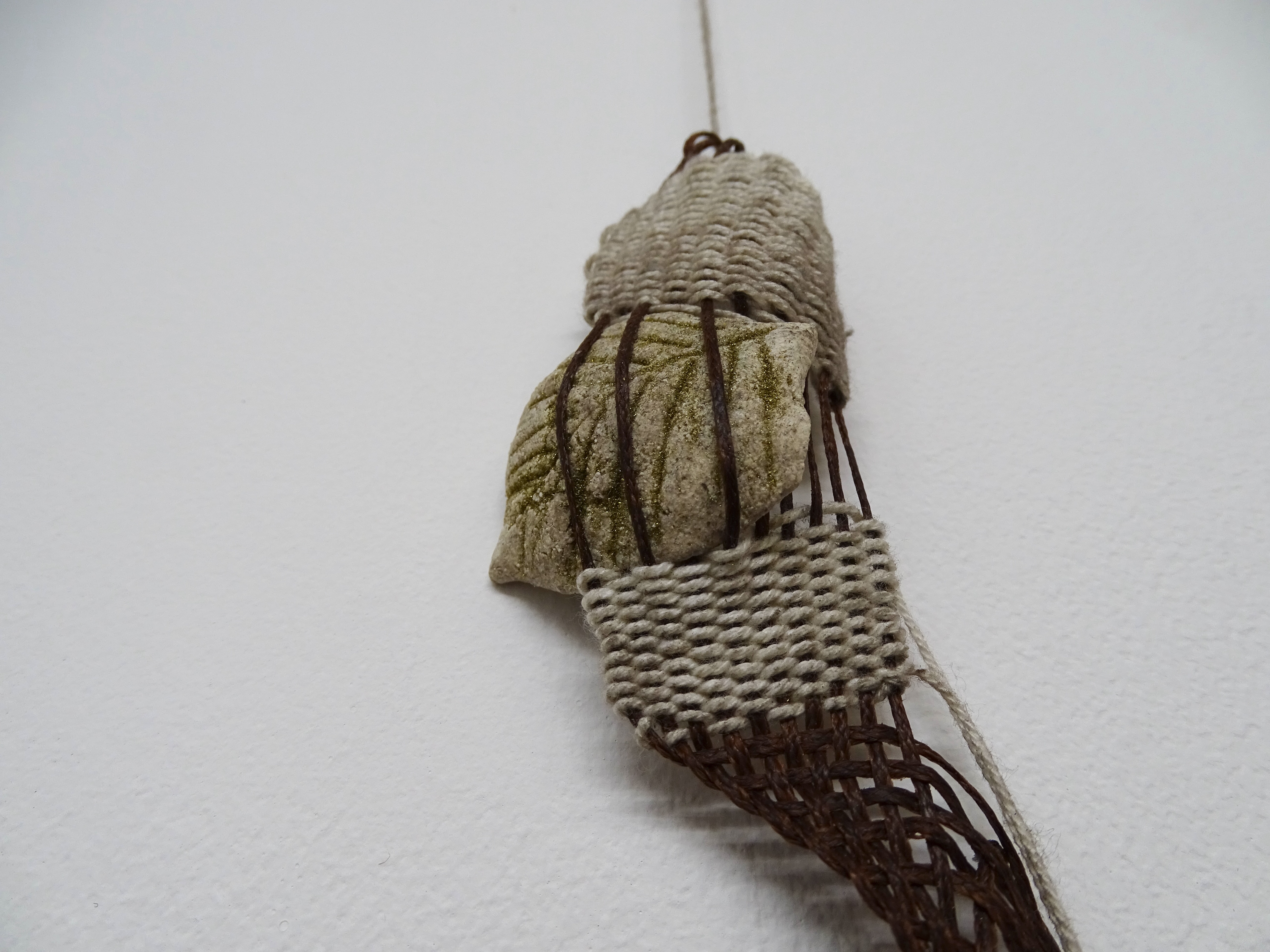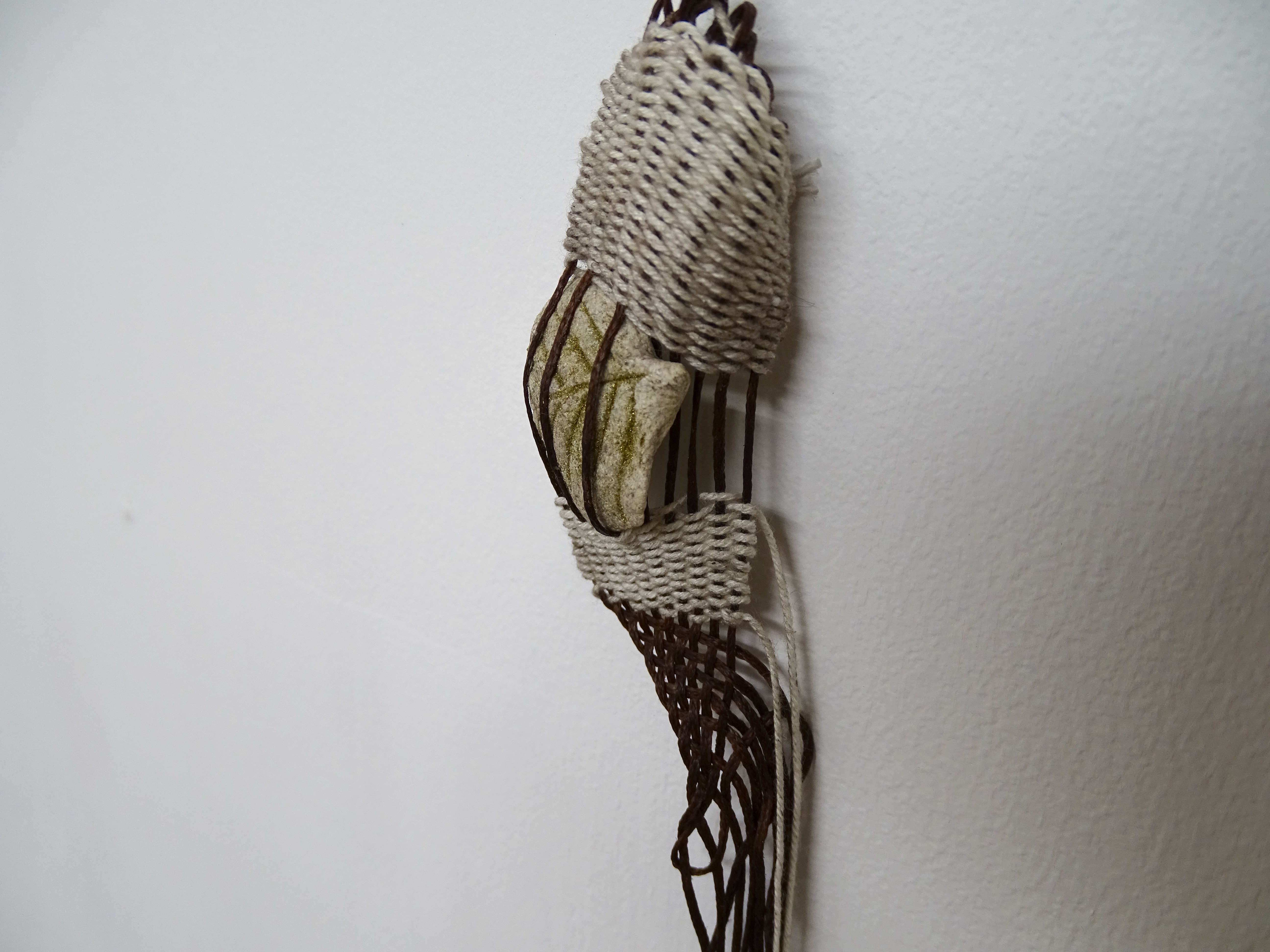 Material experiments: Woven recycled paper, bookbinding thread, brass and eggshell.