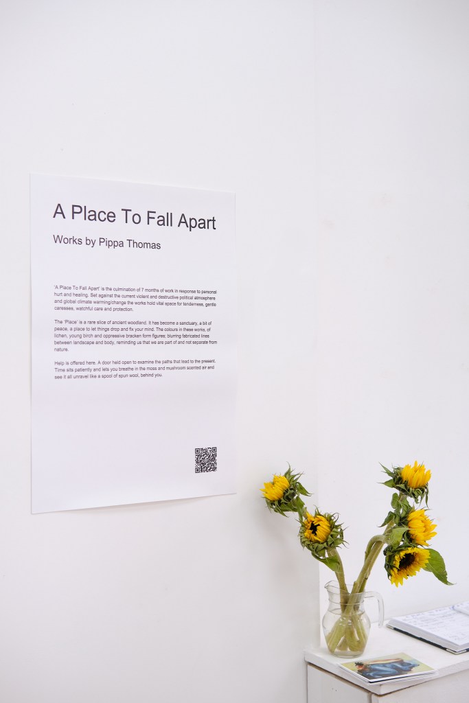 ‘A Place To Fall Apart’ is the culmination of 7 months of work in response to personal hurt and healing. Set against the current violent and destructive political atmosphere and global climate warming/change the works hold vital space for tenderness, gentle caresses, watchful care and protection.
